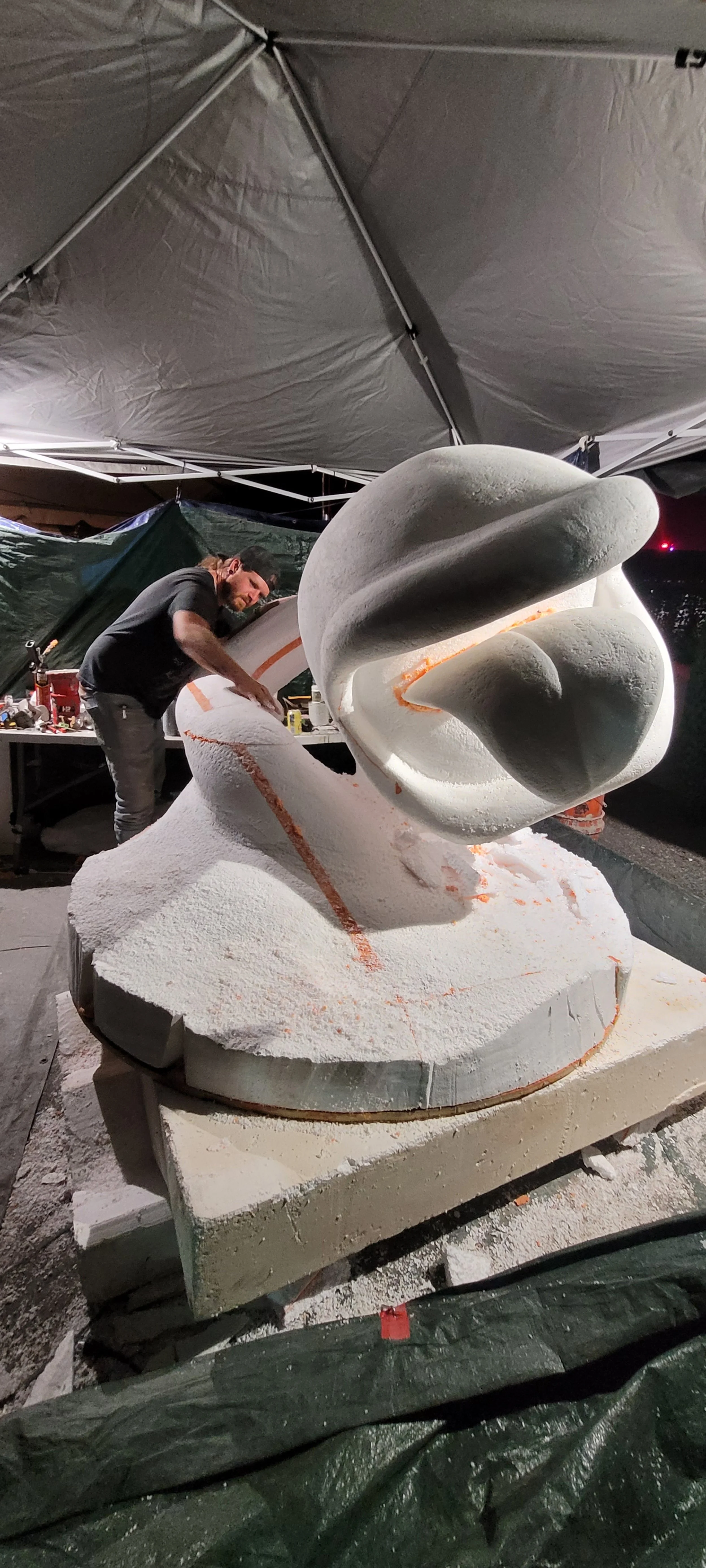 After we got the shapes roughed out, it was time to finish the columns, so Daisy got put on the back burner until they were deployed. Our friends in the Art collective Wake the Giant offered to help with the basalt column installation so with only 48 hours to go until gates opened, we got to carving. Sequoia hand carved and applied each individual spike and tooth, while I dialed in the body, head and tongue. Two very late nights later and we had her carved, and coated with our makeshift polymer coating.